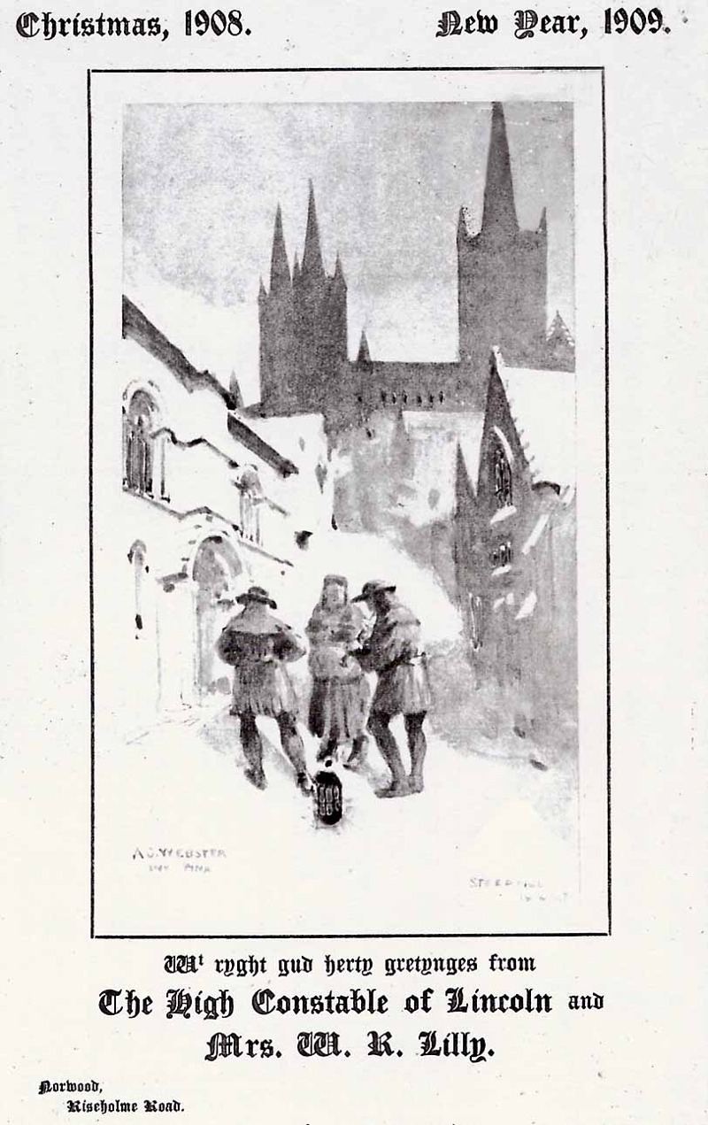 The official Christmas card sent by the High Constable of Lincoln in December 1908 contains a great deal of text as well as the usual picture, or perhaps a not so usual picture, it depicts three shadowy figures - musicians it seems, one blowing what could be an oboe or a shawm - these are Lincoln City Waites, no less.