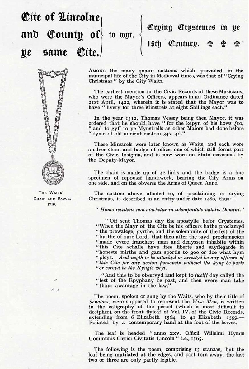 The official Chistmas card, sent by the High Constable of Lincoln, in 1908, quotes unreferenced offical sources, claiming that the custom of Crying Christmas was described as early as 1480. The quote seems to suggest that the Mayor and the Constables would more or less turn a blind eye to any general misconduct - due to the excitement [and increased alcohol consumption] during the 12 days [holiday] of Christmas: "Evere franchest man and dennyssen inhabite within this Citie schalle have free liberte and sayffegarde in honest mirthe and gam sportis to goo or doe what hym pleys". The source goes further by promising that [during the 12 days of Christmas] no man will be attacked or arrested by any officers of this City without a writ from the King himself!