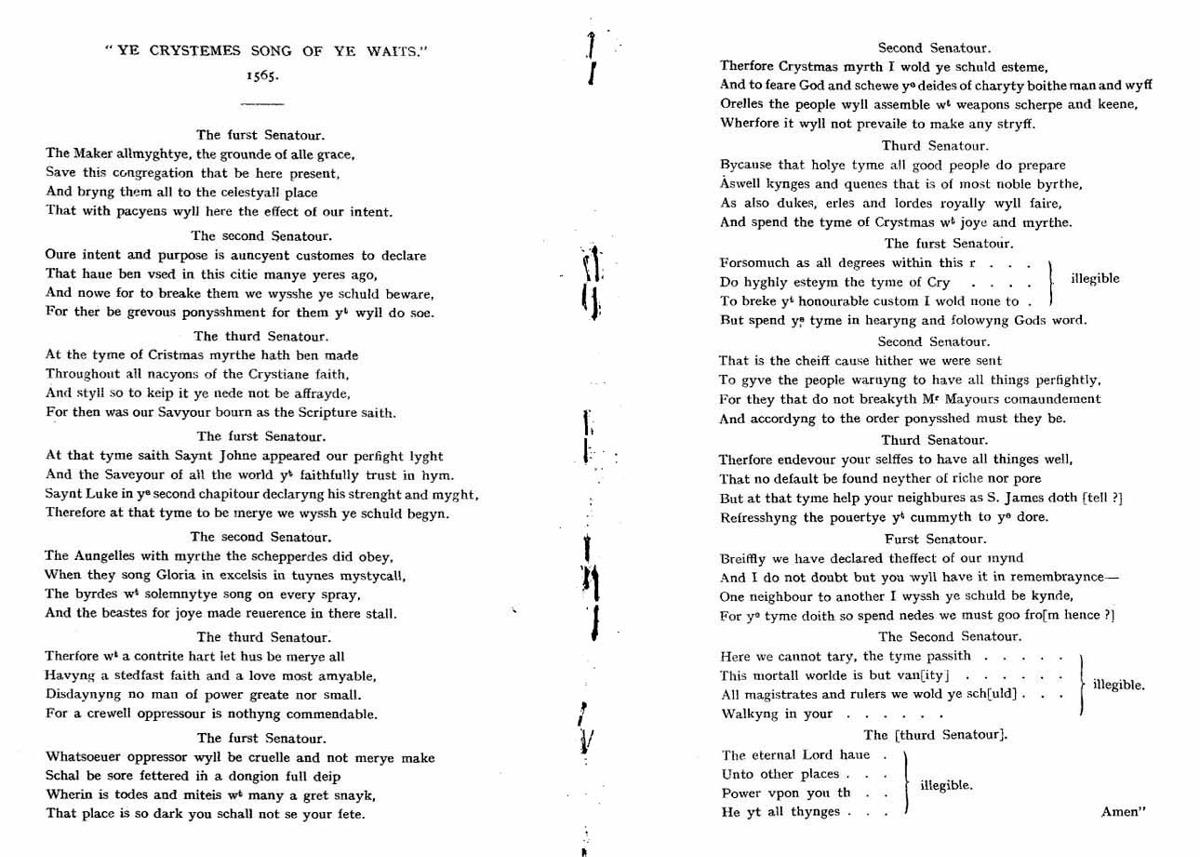 Historians cannot agree whether these verses were spoken or sung. The words of "Crying Christmas" are clearly meant to be delivered by three characters. We know that these were three of the Mayor's Officers because there is a further note in 1571 recording that their robes for Crying Christmas were to be renewed at Civic expense. The urge to supposition, would lead me to wonder whether the three Senatours (Wise Men?) might have been played by the three City Waites, who were certainly appointed by the Mayor/Common Council and who were provided livery coats out of public funds.
